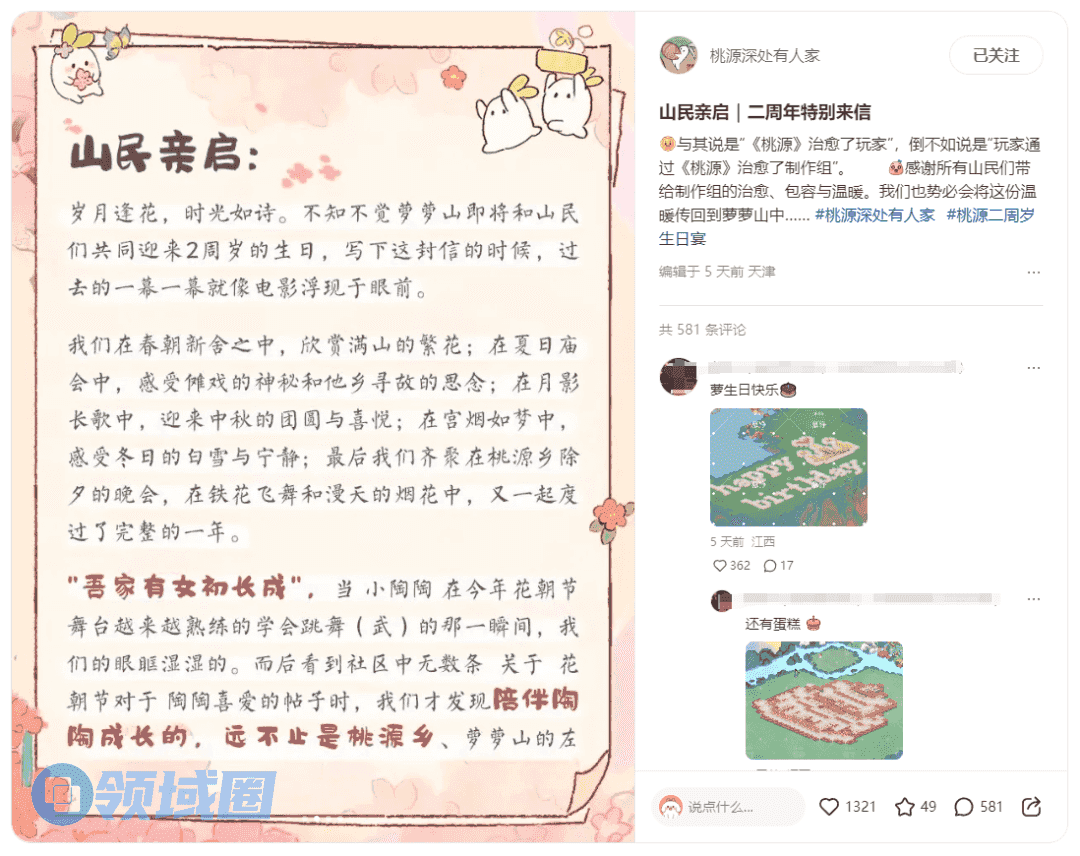 最终,这份信任感也构成游戏得以长线运营的生命力来源。当有路人玩家问“现在适不适合入坑”时,网上看到的评论都是盖楼式的欢迎;当二周年生日送祝福的时候,玩家的祝愿是“要玩桃源一辈子”。