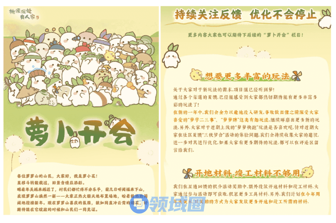 因此,在今年春节,《桃源》全新开辟了“萝卜开会”栏目,专门与玩家共同讨论未来优化方向,对玩家多次反馈的“主线剧情”、“赶山玩法”、“开地和竣工材料”等问题进行了诚恳回应。