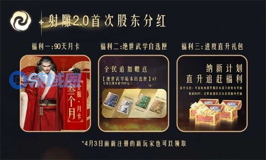 市场对其的认可度同样需要一段时间的观测。1.0的失利让不少开服玩家目前仍持着观望态度,《射雕》率先需要做的,其实是挽回口碑,稳住基本盘后再徐徐图进。官方显然意识到该点,2.0开服初期便放出10亿返利的消息,及至近日,他们还将现有玩家看作初始股东,释放新的福利信号意为“股东分红”,全服送出三个月月卡、自选绝世武学等高价值奖励,游戏内举办的焕新盛典系列活动也将持续至4月9日。
