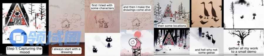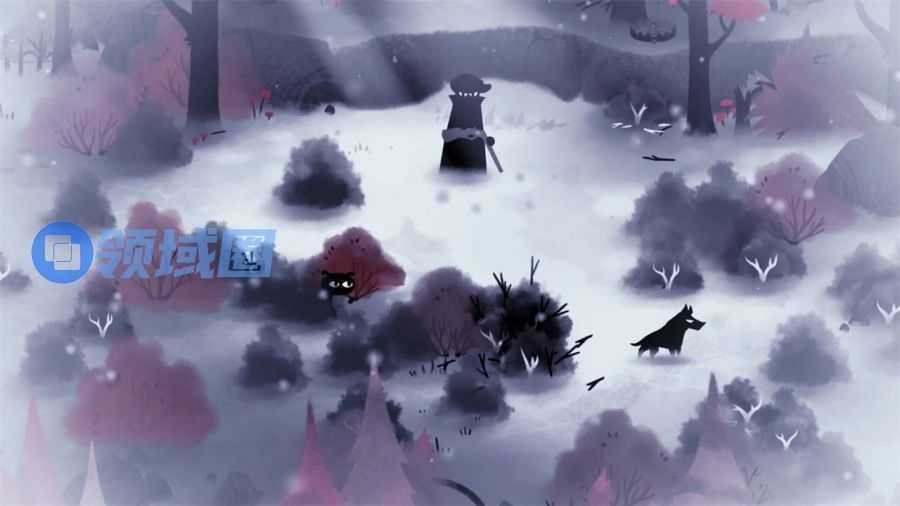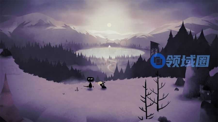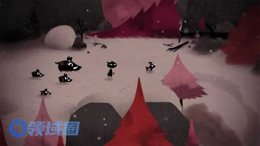 而艺术风格是Ben首先确定下来的第一件事,毕竟视觉吸引法则在当下竞争激烈的游戏市场还是更有机会胜出的。因为当时只有他个人全职创作,所以他增加了一个额外的挑战,那就是找到制作成本不太高但又表现出色的美学。虽然他非常喜欢2D手绘动画的表现力,但考虑到制作成本和角色细节,于是转而选择了将角色设计成没有轮廓、单一的平面阴影颜色。于是,从一张白纸上纯黑色的角色,经过Ben不断的添加/修改,雪地、枯树、小狗、木棍,水彩纹理的加入,美丽的风景就营造出来了。