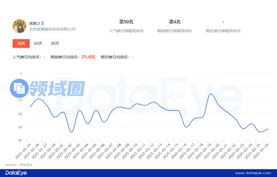 因为这样的情况在曾经的小游戏王者产品《咸鱼之王》身上也出现过。即使《咸鱼之王》难回巅峰,却可以一直活跃在畅销榜。数据显示,《咸鱼之王》近30天依然稳定在畅销榜TOP40内,近90天最高排名一度冲上第4名。