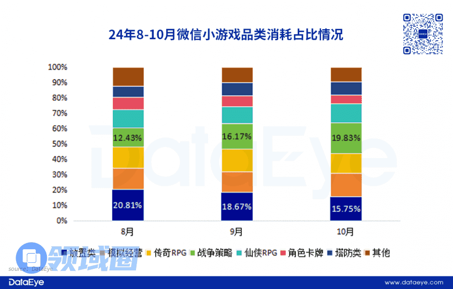 10月之后战争策略品类消耗占比基本维持在20%左右,而放置(含开箱)品类进一步下滑。以最新消耗占比数据显示,战争策略消耗占比超过21%,而放置(含开箱)品类占比下滑至14%。