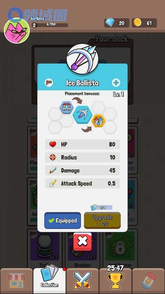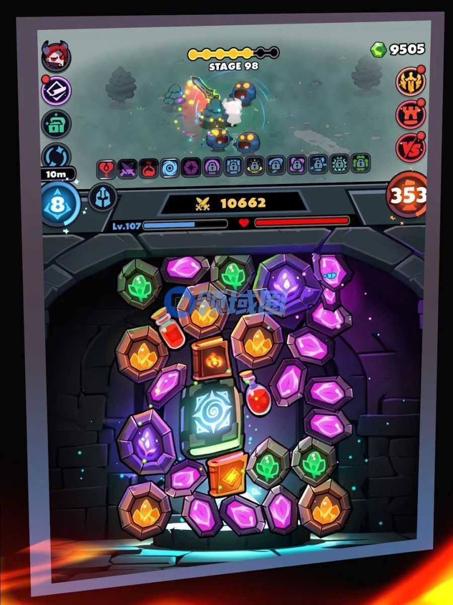 介绍:顶部是放置打怪区,底部是合成升级区,宝石合成各种道具,比如法术、回血等等;右侧装备合成各种装备,可以装备给英雄提高输出。