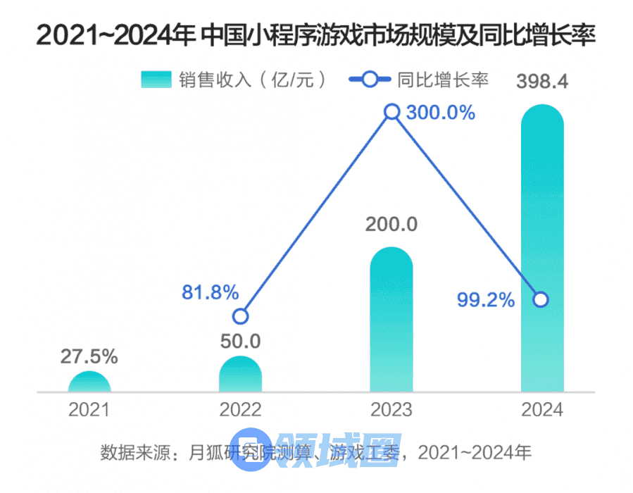 再看小游戏端,据游戏工委数据,2024年我国小程序游戏销售收入达398.4亿元,同比增长99.2%。