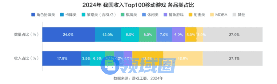 从流水收入占比来看,虽然角色扮演、射击类产品不再是贡献流水的主力品类,但是头部品类市场份额仍旧稳固。