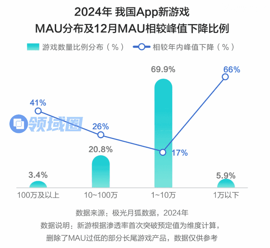 从MAU分布来看,2024年上线的新游仅有3.4%在12月MAU达到100万以上。且相较年内峰值平均下降了41%,头部新游同样面对用户流失的困境。相较之下,长尾新游更难保证用户的留存,12月MAU在1万以下的新游相对年内峰值下滑比例达66%,即便在玩法创新融合的当下,淘汰出局仍旧是新游市场的常态。