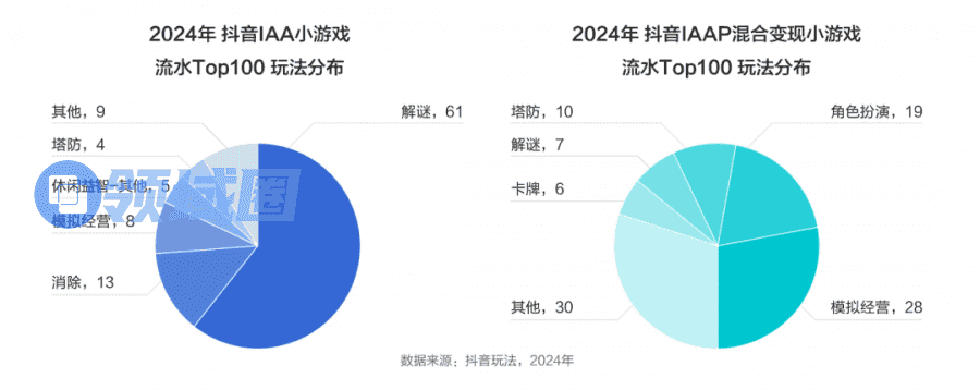 IAA维度下,流水Top100中超8成游戏为休闲益智品类,其中,解谜、消除为主流玩法,诸如《抓大鹅》《聪明的开局》等凭借“复活、获取道具看广告”等模式迅速提升流水。