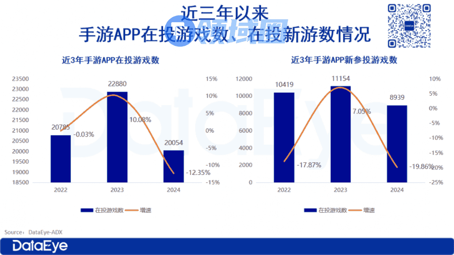DataEye-ADX《2024年国内移动游戏效果广告白皮书》近三年手游APP在投游戏数、在投新游数创三年最低,手游APP处于存量时代,意味着新产品进入市场大规模投放获量难度倍增,以至于项目组对于新品上线愈发谨慎。