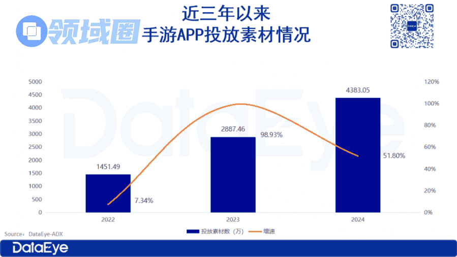近3年手游APP投放素材,2024年手游APP投放素材(视频+图片)为4383万条,同比2023年增长51%,大盘仍在膨胀,增速同比收窄,膨胀的素材主要是达人素材/达人营销,占比大盘约22%。