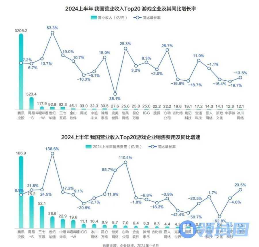 虽然行业竞争日趋激烈,但头部游戏厂商仍能够实现营收水平的同比增长,2024上半年其营收平均同比增长率为3%,增/跌幅最高的企业间差值超80个百分点。