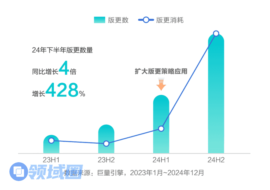 据抖音数据,2024下半年,App游戏版更大推数量大幅增加、同比增长428%;针对版更大推的素材消耗也随之大幅增加,环比实现倍数级增长。