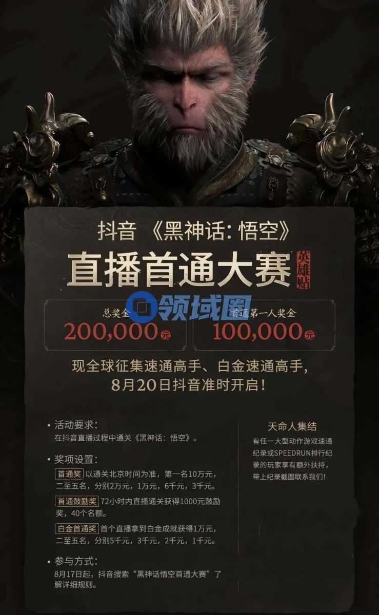 《黑神话:悟空》在抖音的玩法更强调“互动”,联动抖音游戏发起“直播首通大赛”,玩家在抖音直播过程中通关,可以获得对应奖金,刺激用户从观看转向下载。