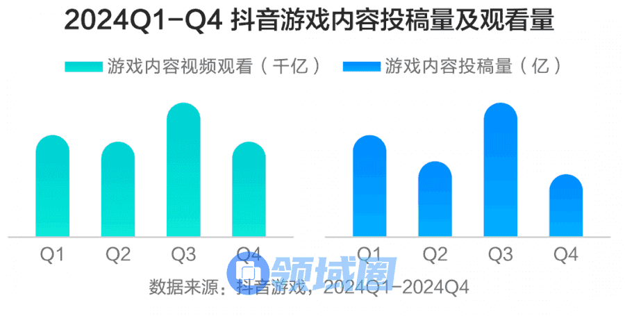 2024年,抖音平台季度游戏内容投稿、播放量在高规模之上保持增长,其中游戏内容视频观看较2023年同比上涨6.88%。
