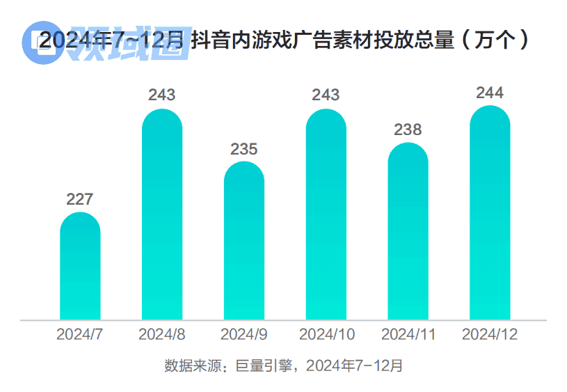 2024年12月全平台游戏类广告素材投放数量已达243.6万个,环比增长2.5%;相对年中,素材数量已增长近8%。