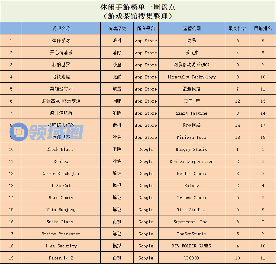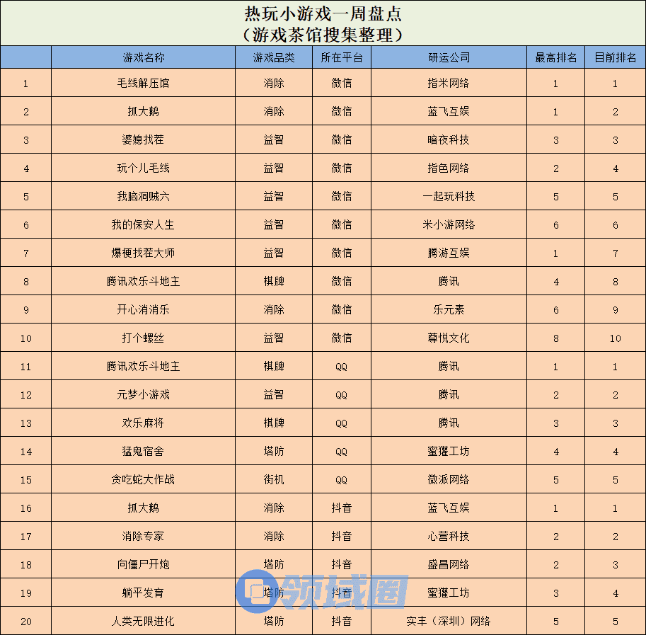 休闲新游周报每周统计微信小游戏、QQ小游戏、抖音小游戏、硬核小游戏以及App Store和Google Play上的新游爆款,并按照分类制作表格,将游戏排名情况等信息进行整理,希望给到行业同侪帮助。