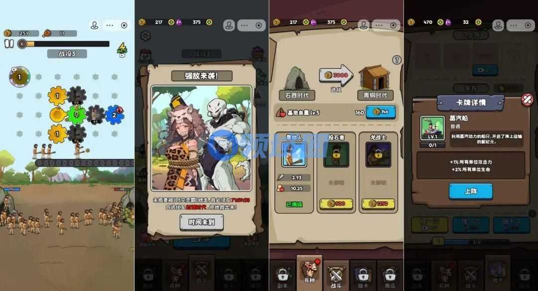 《人类无限进化》则是一款文明更替题材的塔防游戏。游戏主界面上方有一个齿轮放置区域,其中有一个不停转动的主齿,它会推动周边的其他齿轮进行转动,产出更多资源和角色,来抵抗敌人,而玩家在游戏中需要做的,就是消耗肉块数量来获取其他齿轮,增强我方输出效率和战力,打败敌人,同时获得更多肉块奖励,最终消耗掉敌方战力,同时推掉敌方窝点,即可通过关卡。