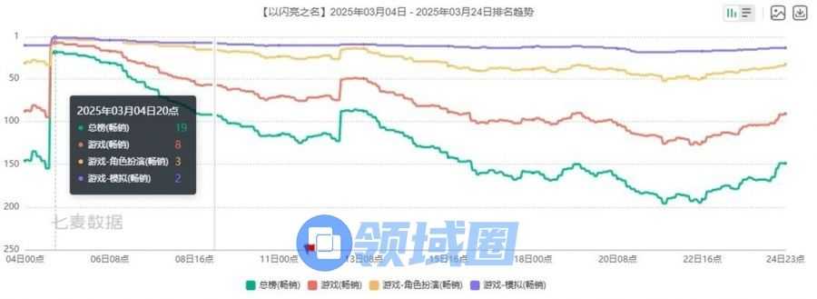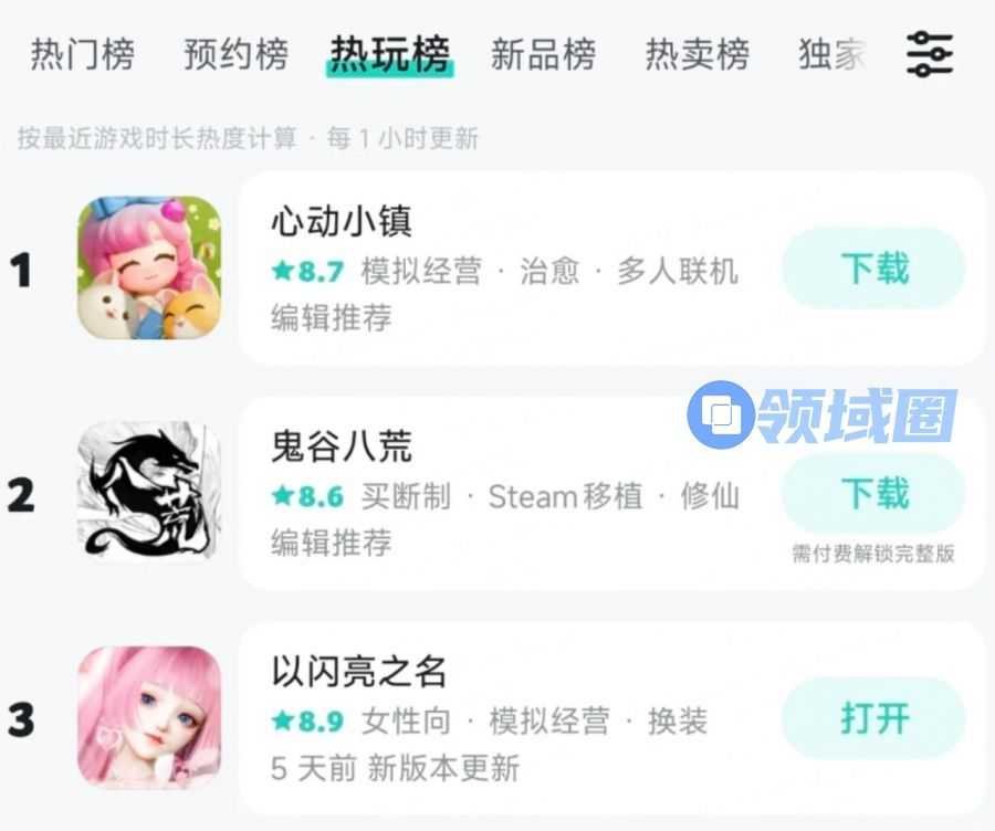 从榜单来看,在更垂类硬核的TapTap平台,《以闪亮之名》在热玩榜常年位列Top3。
