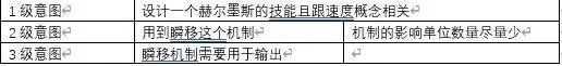 例如要设计一个赫尔墨斯的技能且跟速度概念相关,这个意图可以作为1级意图,那这时候设计师想到,在这个前提下,想要用到瞬移这个机制,那利用瞬移这个意图是作为2级意图。