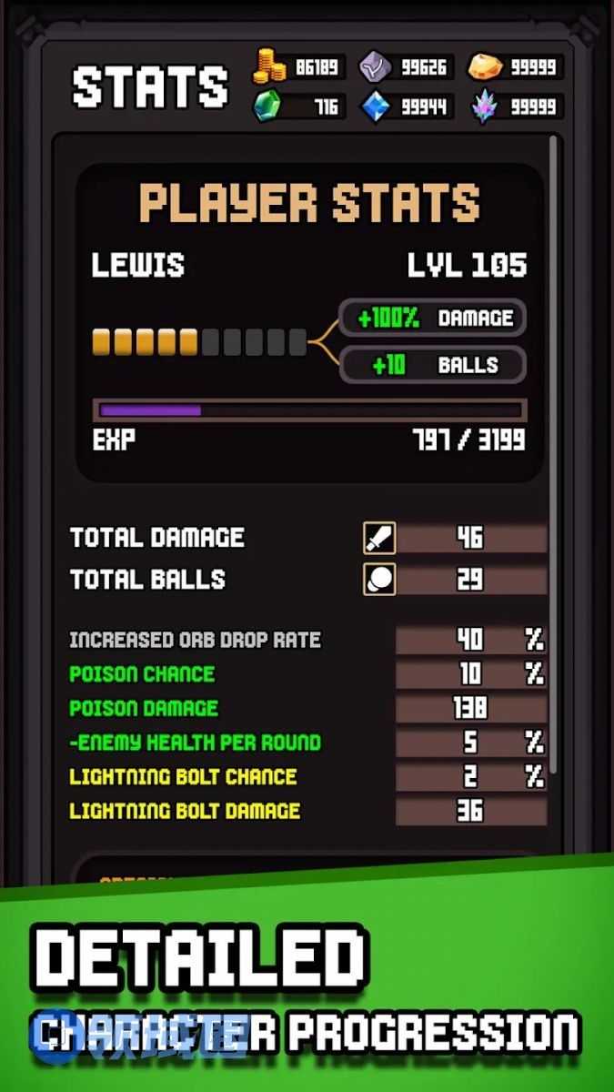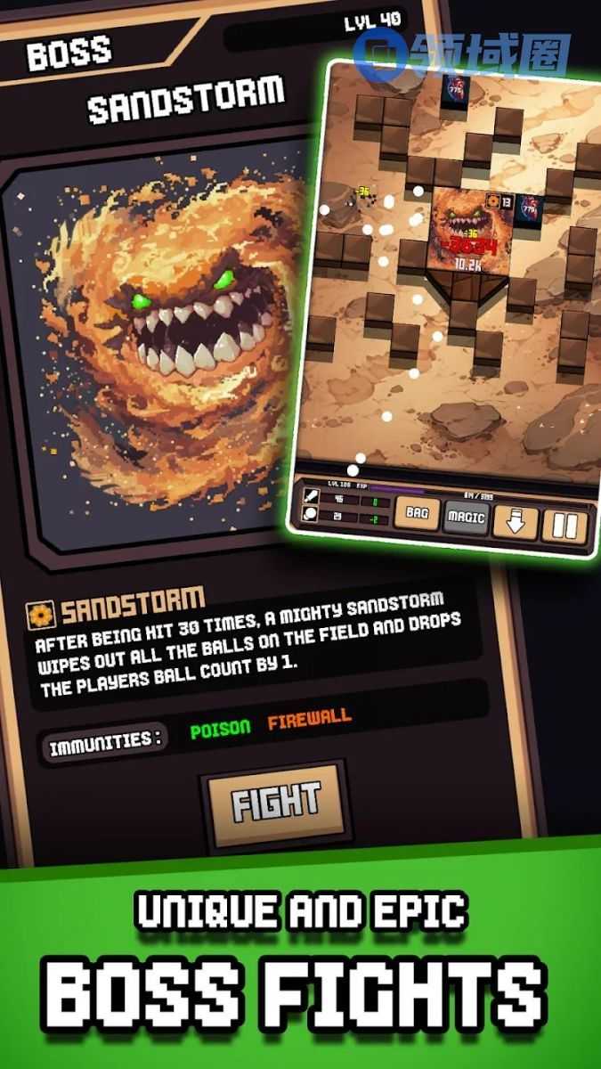 介绍:基础玩法是无尽打砖块过关,增加了RPG的养成数值系统和各种其他玩法,玩家可以培养各种砖块的属性、技能、能力等等。但我个人觉得这套像素画风拖了游戏玩法的后腿,如果做成《砰砰法师》那种画风和外围,游戏应该要比现在的上限高很多。