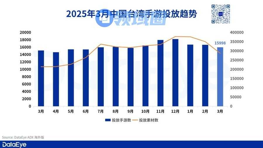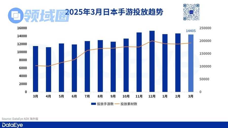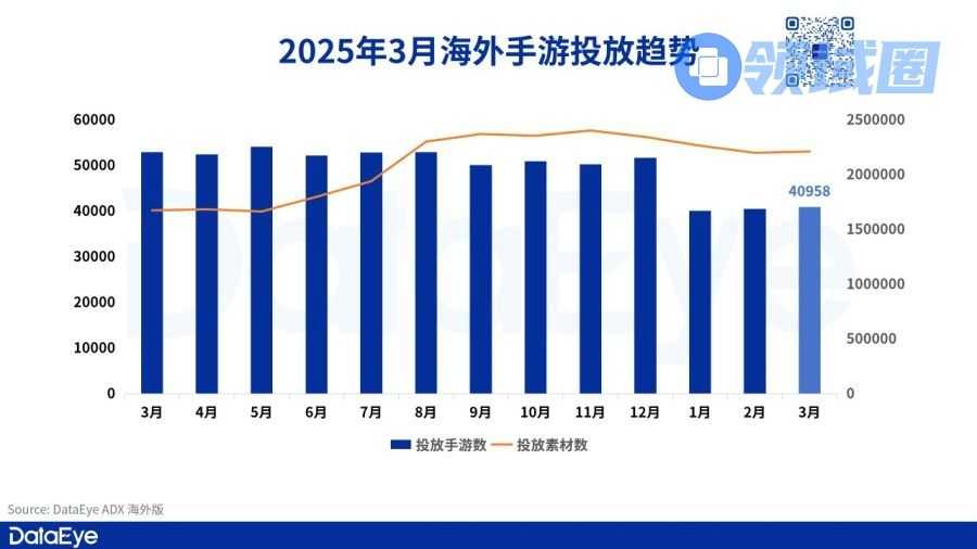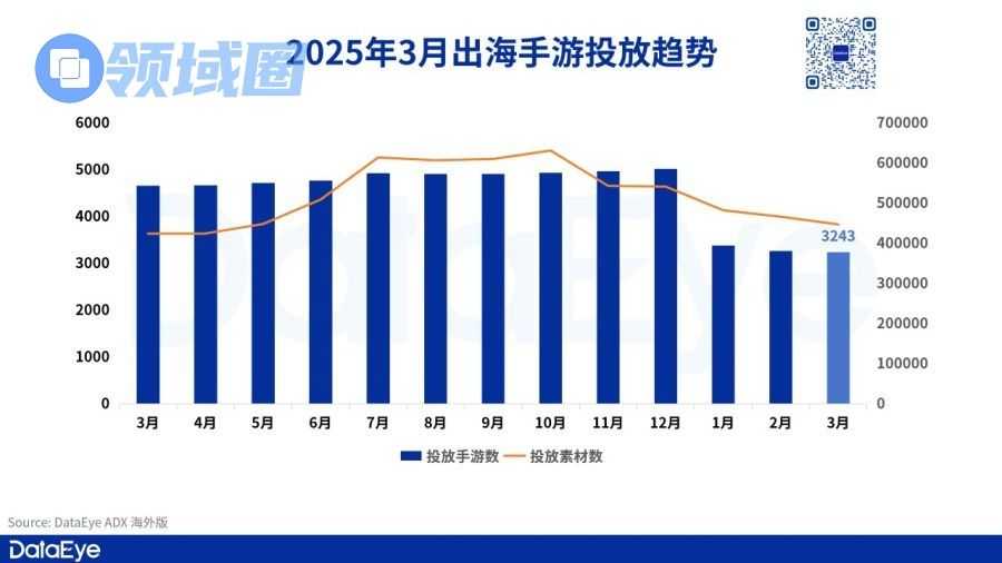 DataEye ADX海外版数据显示:2025年3月中国大陆出海投放的手游数为3243款,整体与前两个月的数量持平。在出海投放的素材数上,3月份的数字则约为45万组,比起上个月小幅下降4%。