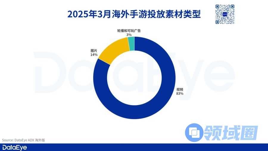 在3月份的海外市场手游素材类型占比上,视频素材占比83%,图片素材占比14%,而上个月素材量有所上涨的轮播和可玩广告类型本月再次下滑至3%的占比。