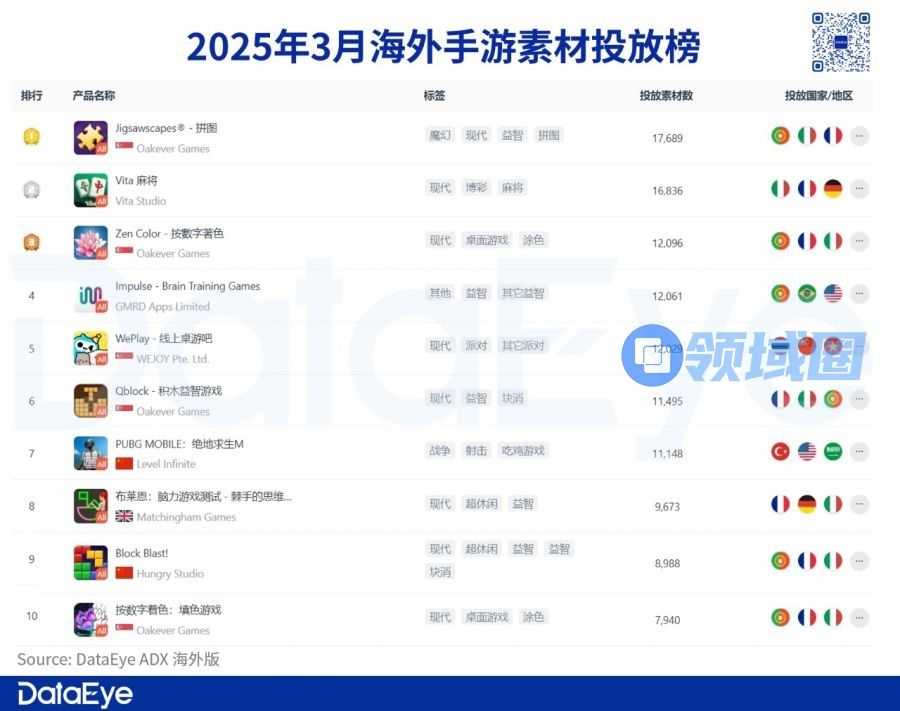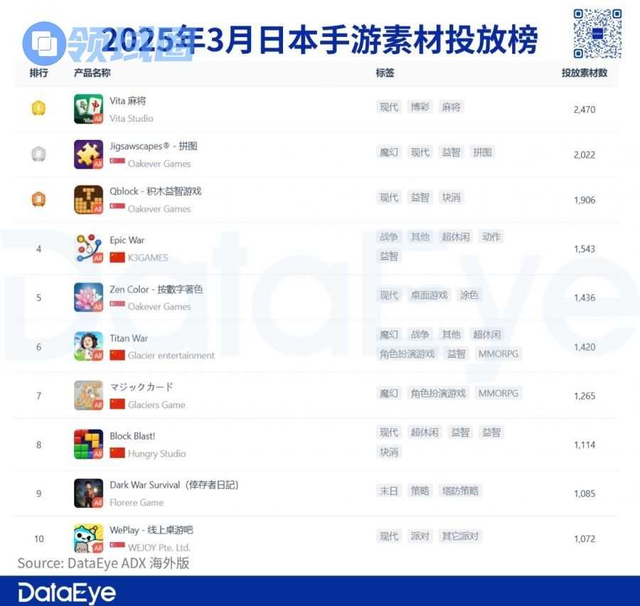 在3月的日本手游素材投放榜上,Oakever Games和冰川网络旗下的产品共占了6个位置,益智产品和副玩法买量是目前日本市场最活跃的投放类型。