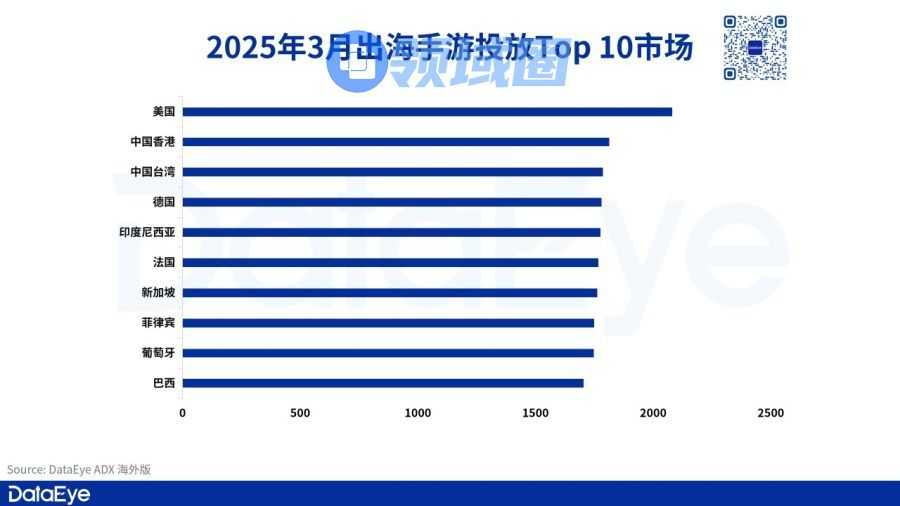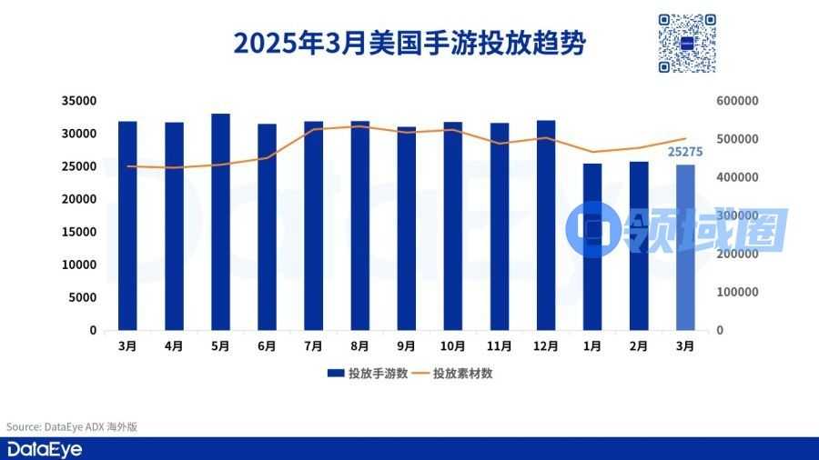 DataEye ADX海外版数据显示:2025年3月大陆以外的海外市场进行投放的手游数约为4万款,与今年前两个月的数字持平。海外应用商店不断清洗不合规的中腰部和尾部产品,全球参与广告投放的手游数量都有所减少。