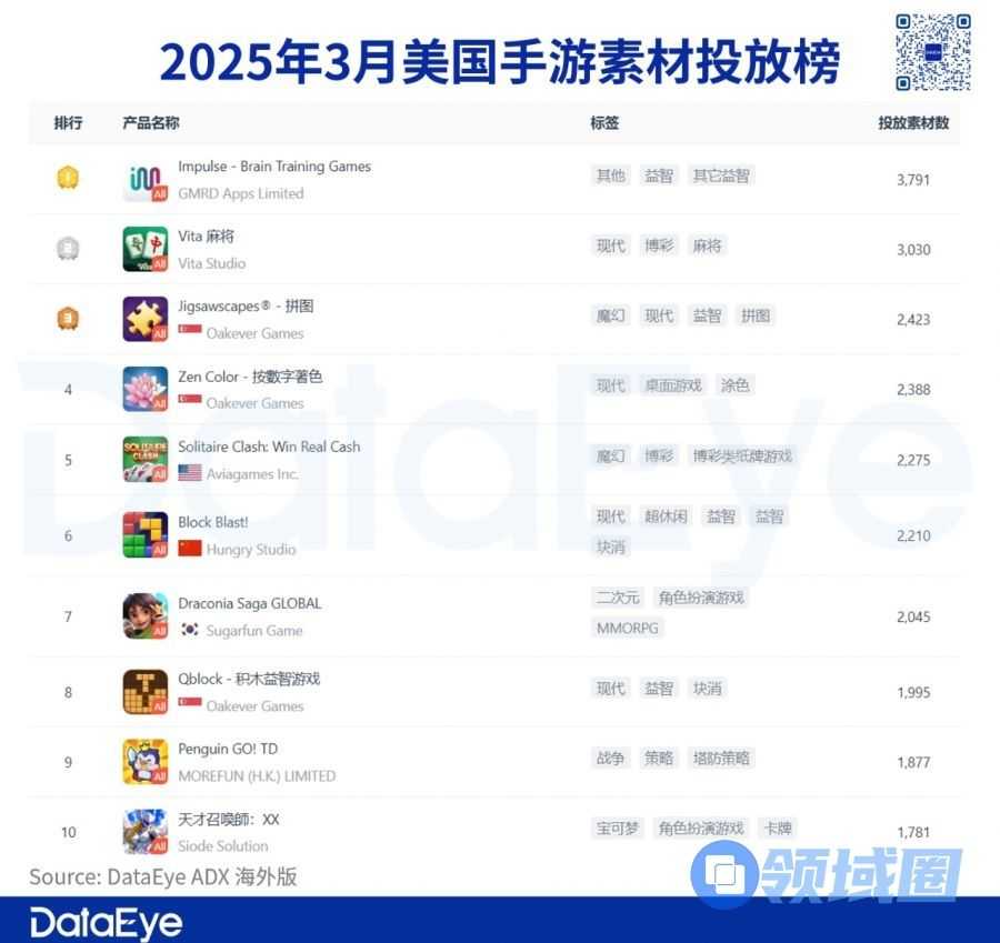 3月的美国手游素材投放榜Top 5均为益智/纸牌游戏。Oakever Games旗下产品在Top 10中占据4席。