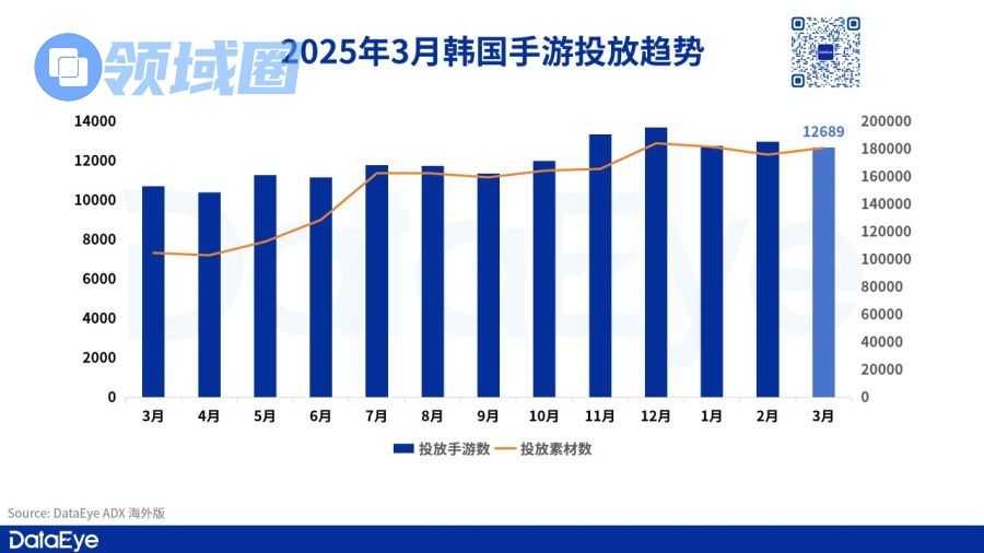 韩国市场在3月份的投放趋势是产品数稍微下滑、但素材数稍微回升。该市场的单月投放手游数保持着12万款的规模,投放素材数则是18万组的水平。