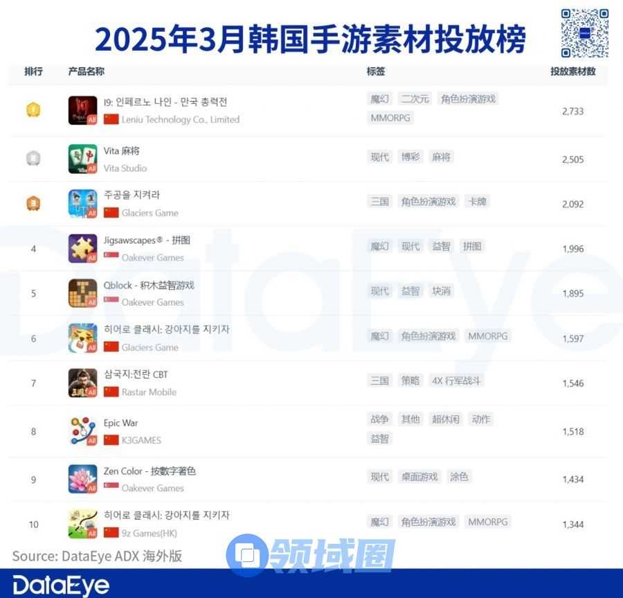 乐牛的MMORPG《I9: 인페르노 나인》继续主攻韩国市场,延续2月份的表现本月再次为韩国单月投放量最多的游戏,共投放超2700组素材。