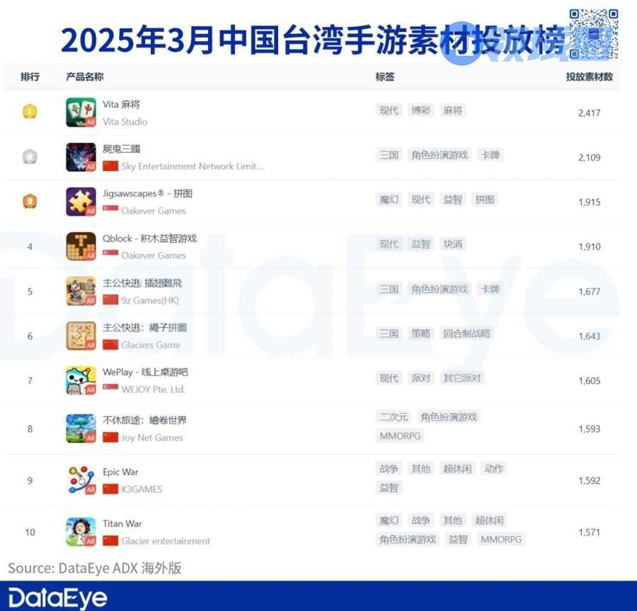 在3月的中国台湾省手游素材投放榜上,天游网络的《尸鬼三国》在上线台湾省市场后,单月投放素材量超2100组,排在素材投放榜第二的位置。游戏的素材创意围绕着“尸鬼化三国英雄”的概念展开,有着相当高的吸睛度。