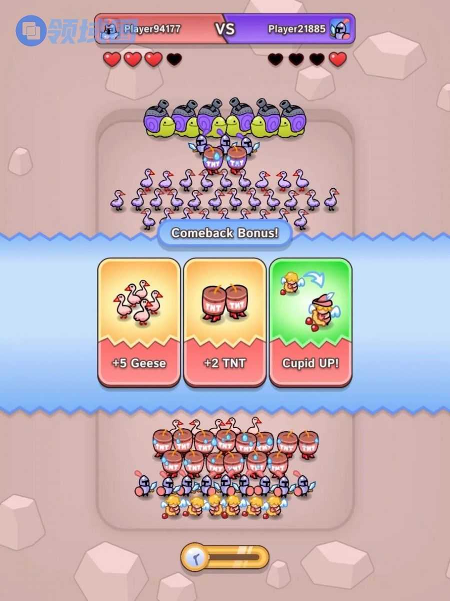 介绍:玩家组建一个兵种小队,近战大鹅、火药桶、骑士、远程弓箭手等共4个兵种出战匹配1v1,每消灭对方一次则积一分然后肉鸽BUFF3选1,直至一方先拿到4分则结束。BUFF里可以给兵种增加数量、进化等。