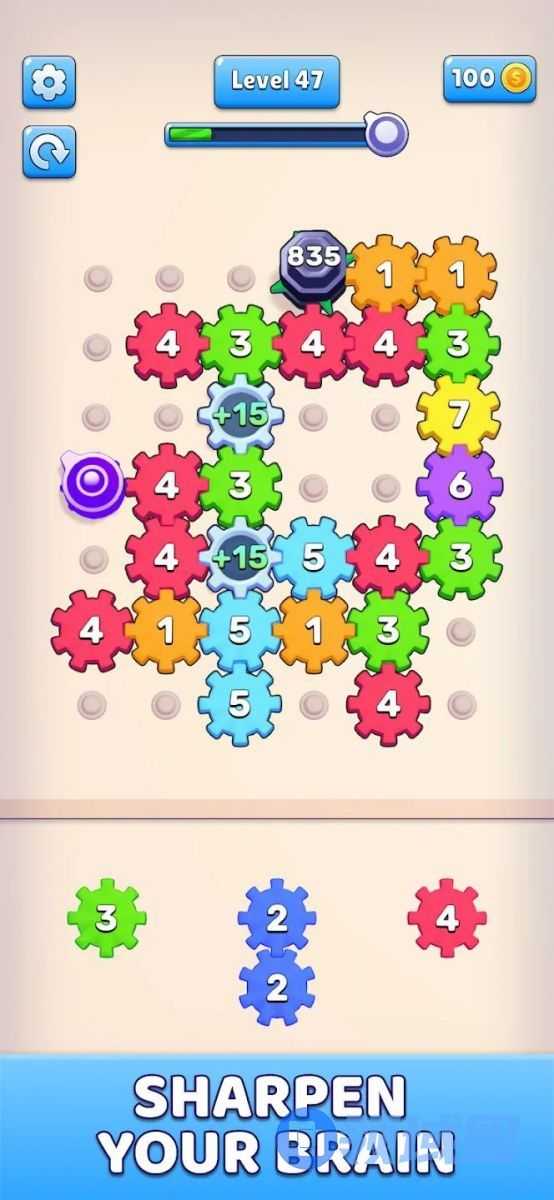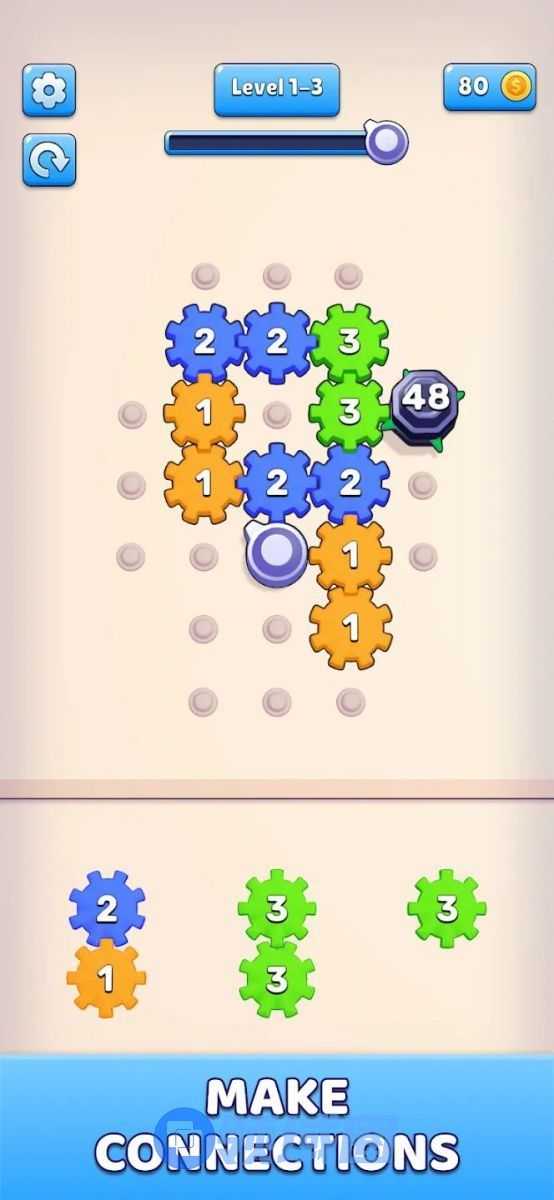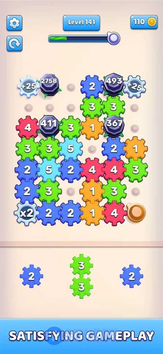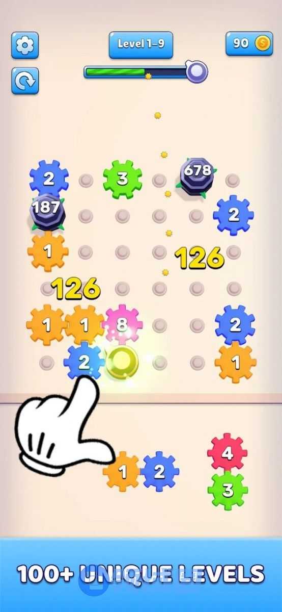 玩家使用齿轮传统的形式,在每关中消除对应螺栓上方分数的齿轮分,消除方式就是通过齿轮耦合连通从起点到分数螺栓之间的通路,齿轮等级越高,加分越多,齿轮等级靠3合merge的形式来提升。