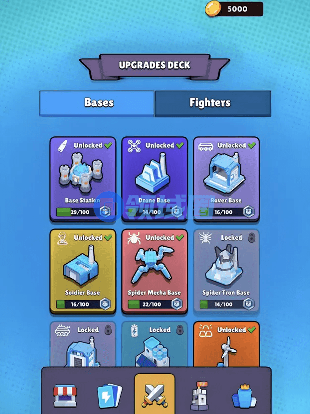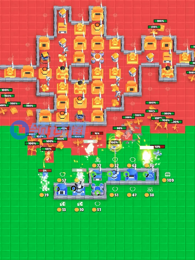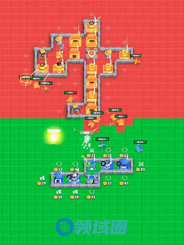 介绍:玩家和对手位于屏幕上下两端,初始采矿得金币,可以花金币拓展基地,可以扩建城墙、步兵、无人机、炮台等攻防建筑,攻击类建筑每隔一段时间造兵,然后自动攻击对手,也可以造金币资源类建筑产钱。