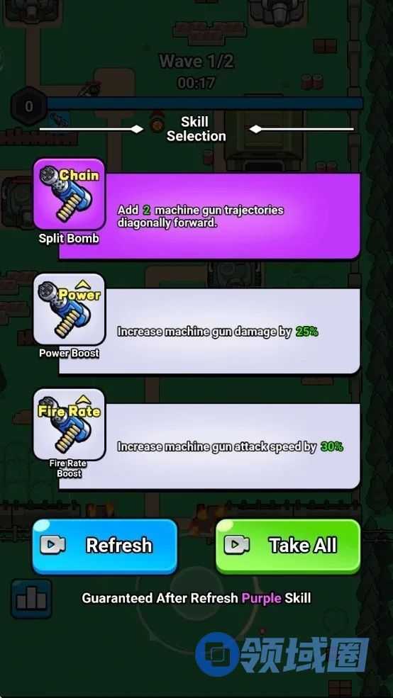 但是却意料之外的效果不错,因为一方面确实早期街机、主机的战车游戏视角和玩法机制就是这样的,跟《弓箭传说》无缝连接,另外加上3选1buff的肉鸽系统,整体也不违和,我个人认为是效果超出预期的换皮。