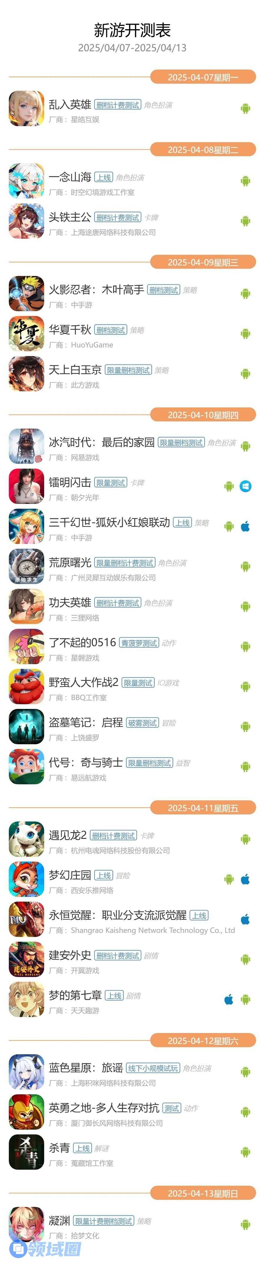 GameRes游资网统计了2025年4月7日—2025年4月13日的最新手游开测信息,共有24款游戏开测。以下是开测信息: