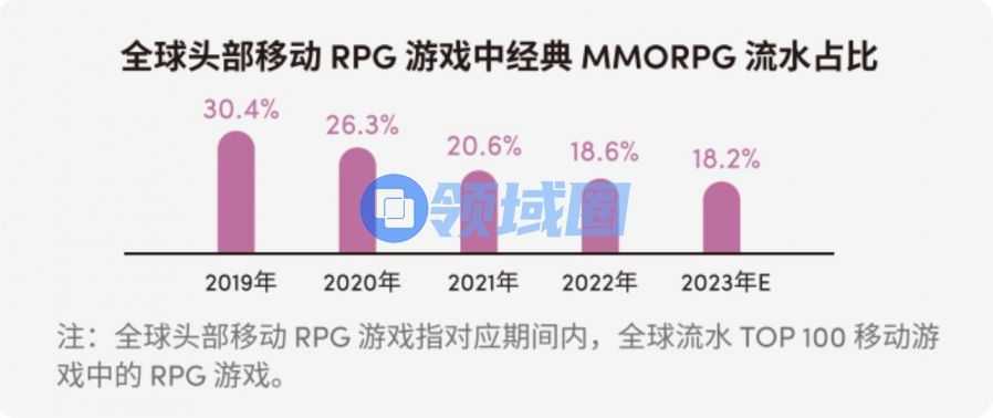 在新品类冲击与玩家游玩习惯变迁等多重因素的影响下,MMORPG的市场空间逐渐缩小,多篇报告指出该品类疲态渐显,如《2023 RPG 游戏全球营销白皮书》显示,全球头部MMORPG手游在RPG大盘中的占比逐年下降,从2019年的30.4%降到2023年的18.2%。
