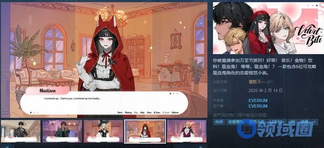羽毛所运营的《轻咬丝绒》原名《Velvet Bite: Softly, with Teeth》,由美国的永恒画廊(Everium)游戏工作室制作并发行,于今年2月14日在Steam平台上线。