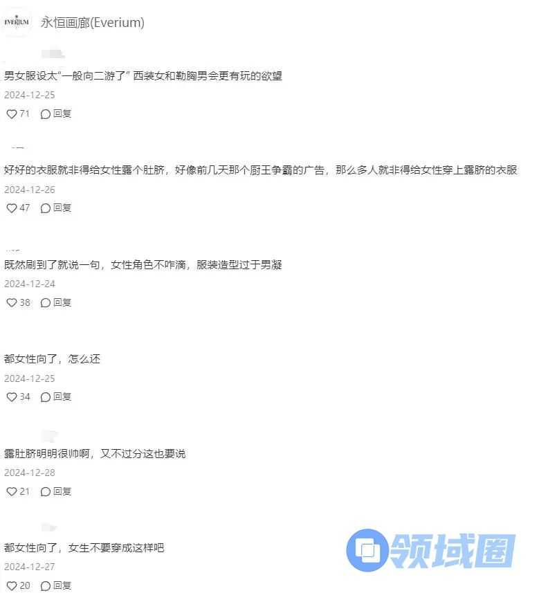 翻阅永恒画廊账号评论区,最大的争议点在女性角色设定。不少人评价露肚脐的女性角色“服装造型过于男凝(男性凝视)”,太像“一般向二游了”“都女性向了,女生不要穿成这样吧。”