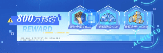 800万!不仅仅是一个数字,更见证了被选召者们对数码宝贝的热爱!为了回馈大家的热情,《数码宝贝:源码》准备了里程碑奖励。当预约人数达到80万、300万、500万、800万,会解锁对应的里程碑奖励,所有被选召者进入游戏后皆可领取。800万预约达成后,更有冒险专属头像框、400数码蓝钻、10万数码金币免费送!