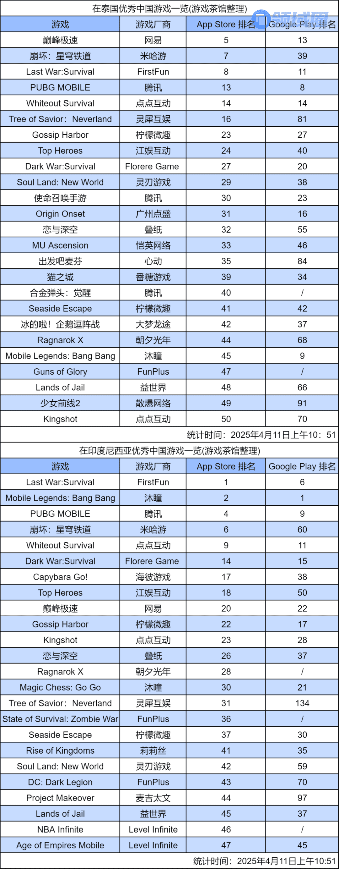 在本期东南亚出海秀中,网易自研竞速游戏《巅峰极速》和FirstFun发行的《Last War: Survival》分别是在泰国和印度尼西亚表现最好的游戏。