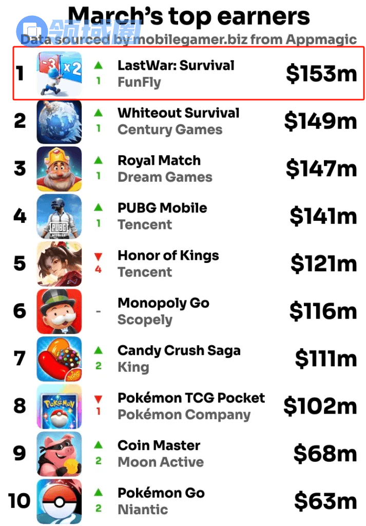 关于休闲SLG《Last War:Survival》,大家已不陌生。自2023年底上线以来,这款游戏已成功攻下全球多地区市场,在今年1月创下1.65 亿美元的月收记录,稳居全球手游收入榜Top3。而在mobilegamer.biz最新统计的3月手游全球收入榜,《Last War:Survival》登上榜首,但3月收入相较高峰值略微下滑,为1.53 亿美元。