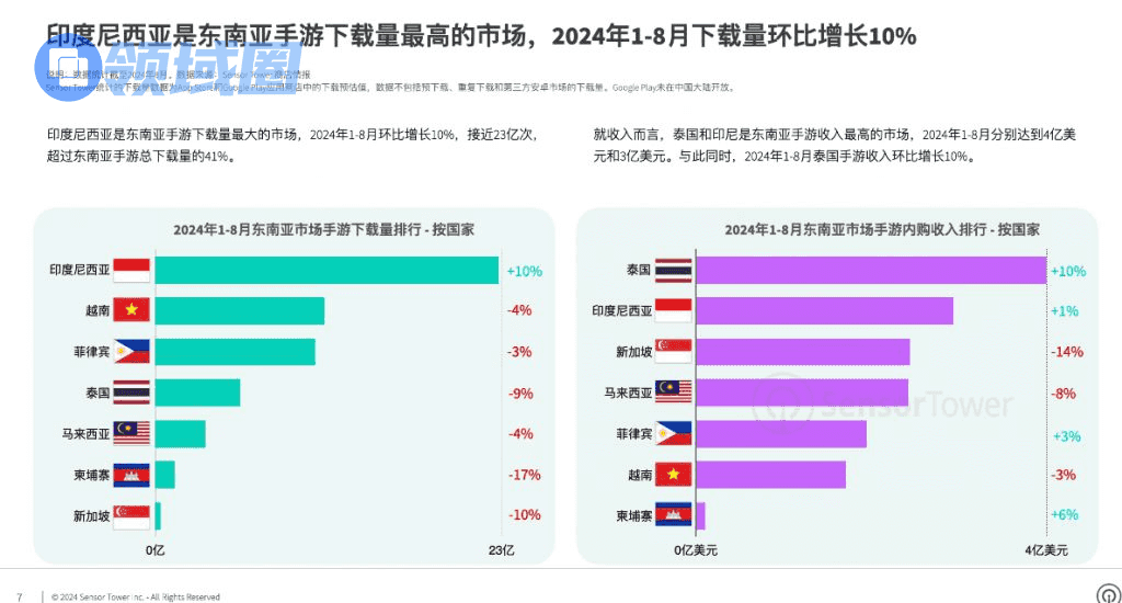 而据Sensor Tower发布的最新报告《2024年东南亚手游市场洞察》,2024年上半年,东南亚市场手游下载量环比提升3.4%至42亿次,其中,印度尼西亚是东南亚手游下载量最高的国家,贡献了41%的总下载量,而泰国和印度尼西亚则是东南亚手游内购收入最高的地区。