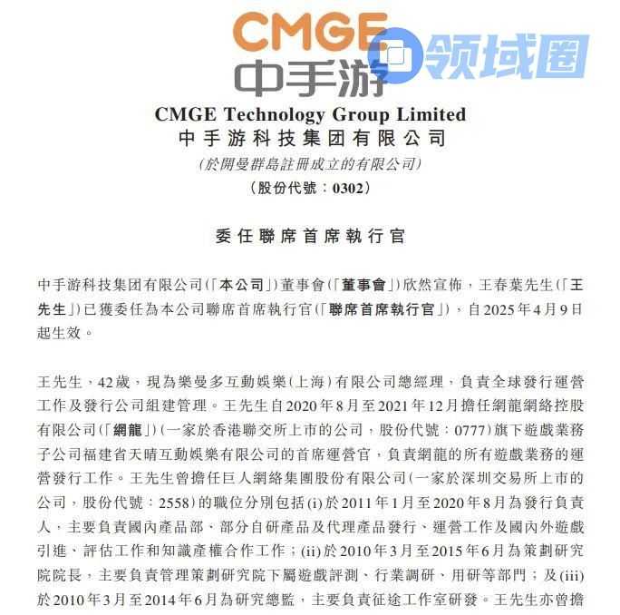 近日,中手游发布公告,宣布王春叶将担任本公司的联席CEO,自2025年4月9日起生效,为期3年。