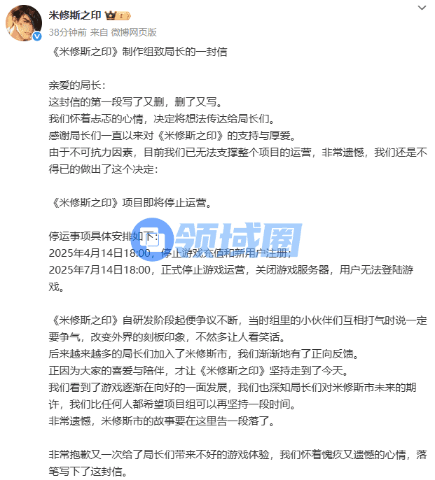今(14)日,由深圳安尼帕开发的末世恋爱乙游《米修斯之印》(以下简称《米修斯》),突然宣布停运。