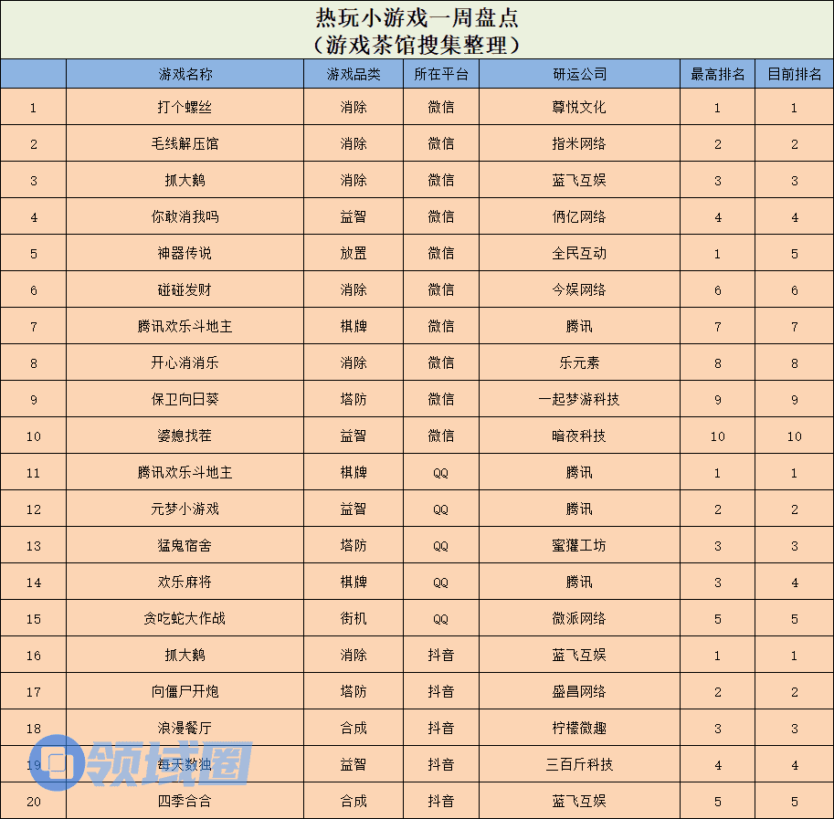 在微信小游戏人气榜单中,本周消除小游戏表现格外突出,直接包揽了榜单TOP3,其中经典的螺丝消除小游戏《打个螺丝》拿下榜首,指米网络的新爆款《毛线解压馆》和蓝飞互娱的《抓大鹅》分别位于榜单第2和第3名。
