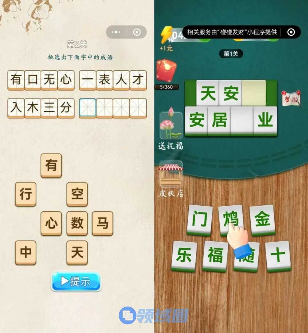 这两款游戏玩法类似,玩家只需要在关卡提供的文字卡片中进行选择,将其填到对应的空位中,组成完整的词语或者成语,即可通关。区别在于,《碰碰发财》在美术包装上,选择了“麻将牌”的形式。