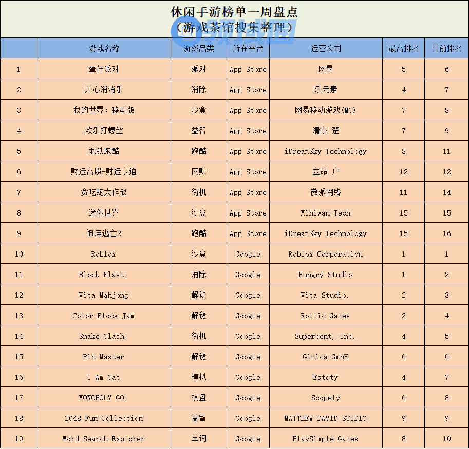 休闲新游周报每周统计微信小游戏、QQ小游戏、抖音小游戏、硬核小游戏以及App Store和Google Play上的新游爆款,并按照分类制作表格,将游戏排名情况等信息进行整理,希望给到行业同侪帮助。