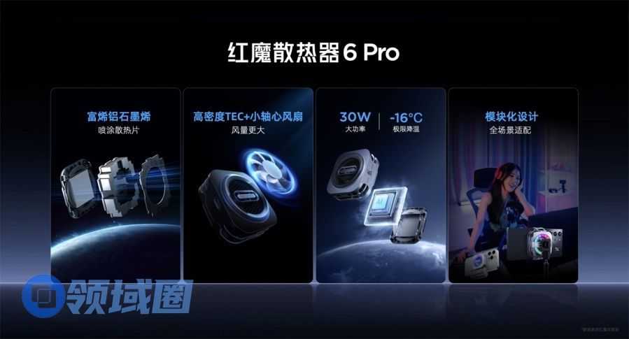 除了定制礼盒,红魔的散热器也有新亮点。红魔散热器6 Pro磁吸版采用富烯铝石墨烯散热片+高密度TEC半导体,配合小轴心风扇灯,极限降温至-16℃。多模块化设计,可配合无线充电模块、直播支架模块等,满足户外游戏、直播散热、边充电边散热等多场景需求。