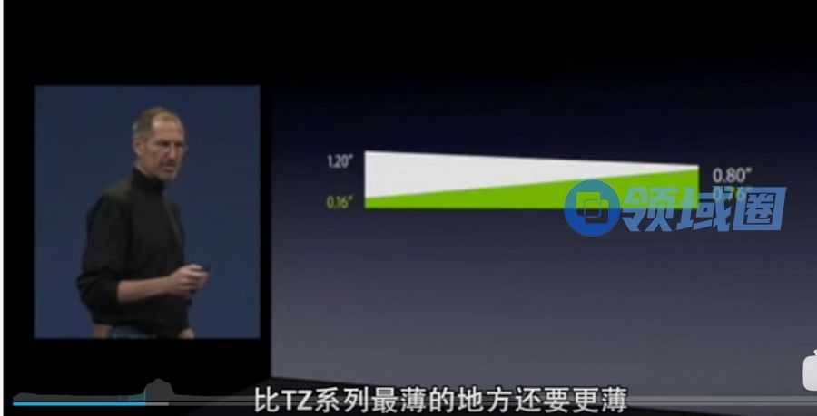 在拿出笔记本之前。,做了相当大的铺垫,介绍了市面上超薄的笔记本TZ系列,然后告诉将推出的笔记本电脑最厚的一侧比TZ最薄的一侧还要薄。通过强烈的对比:一切胃口吊足,观众的已经“无法想象”这样的产品时,再从一个反差最强烈的地方拿出来: